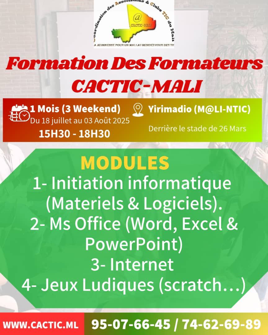 Conformément à ses prérogatives de former des formateurs et se faire développer sur le plan personnel, sur le bon usage du numérique et les avantages qu’il regorge, la coordination organise une formation des formateurs dans le cadre des préparatifs des *Vacances CACTIC 2025* et du renforcement de sa pépinière de pôle de formateurs.